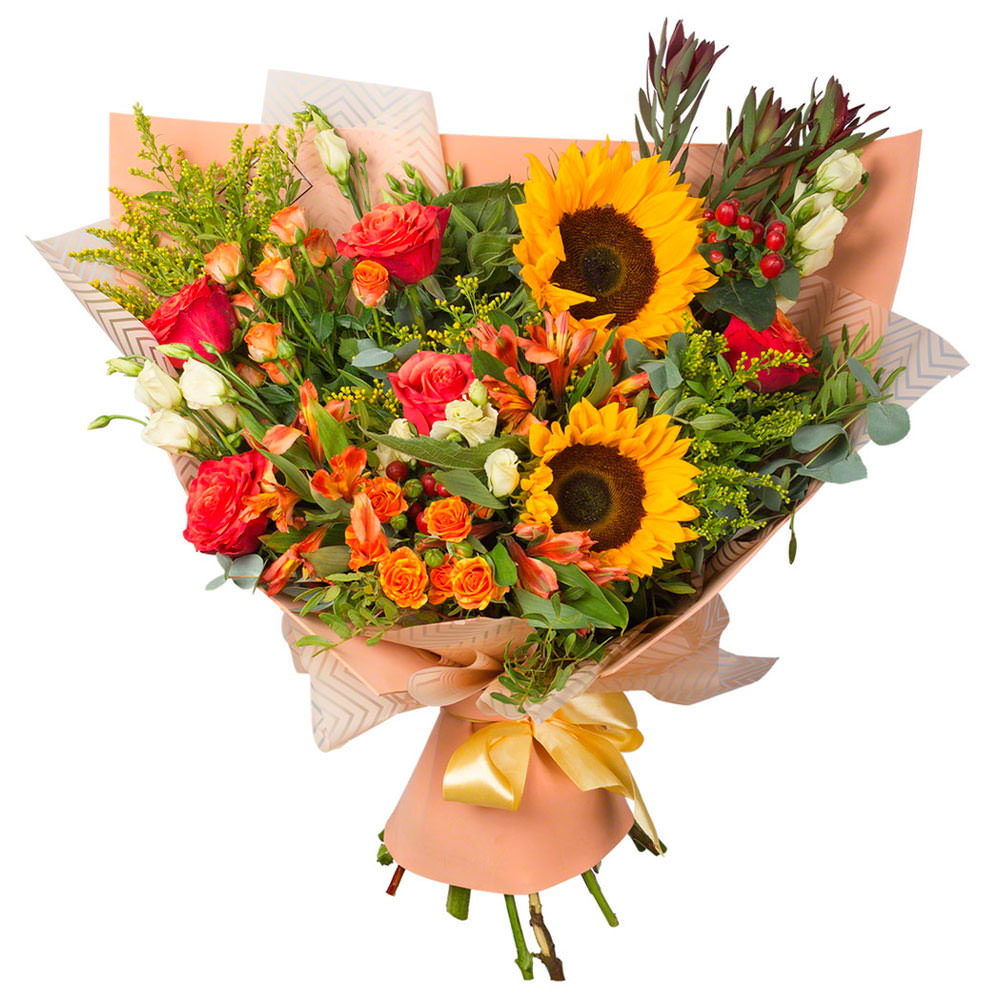 Подсолнух, роза кустовая оранжевая, роза одноголовая красная, эустома белая, альстромерия оранжевая, экзотическая зелень. Упаковка (лента, пленка, крафт, сетка, пленка матовая)