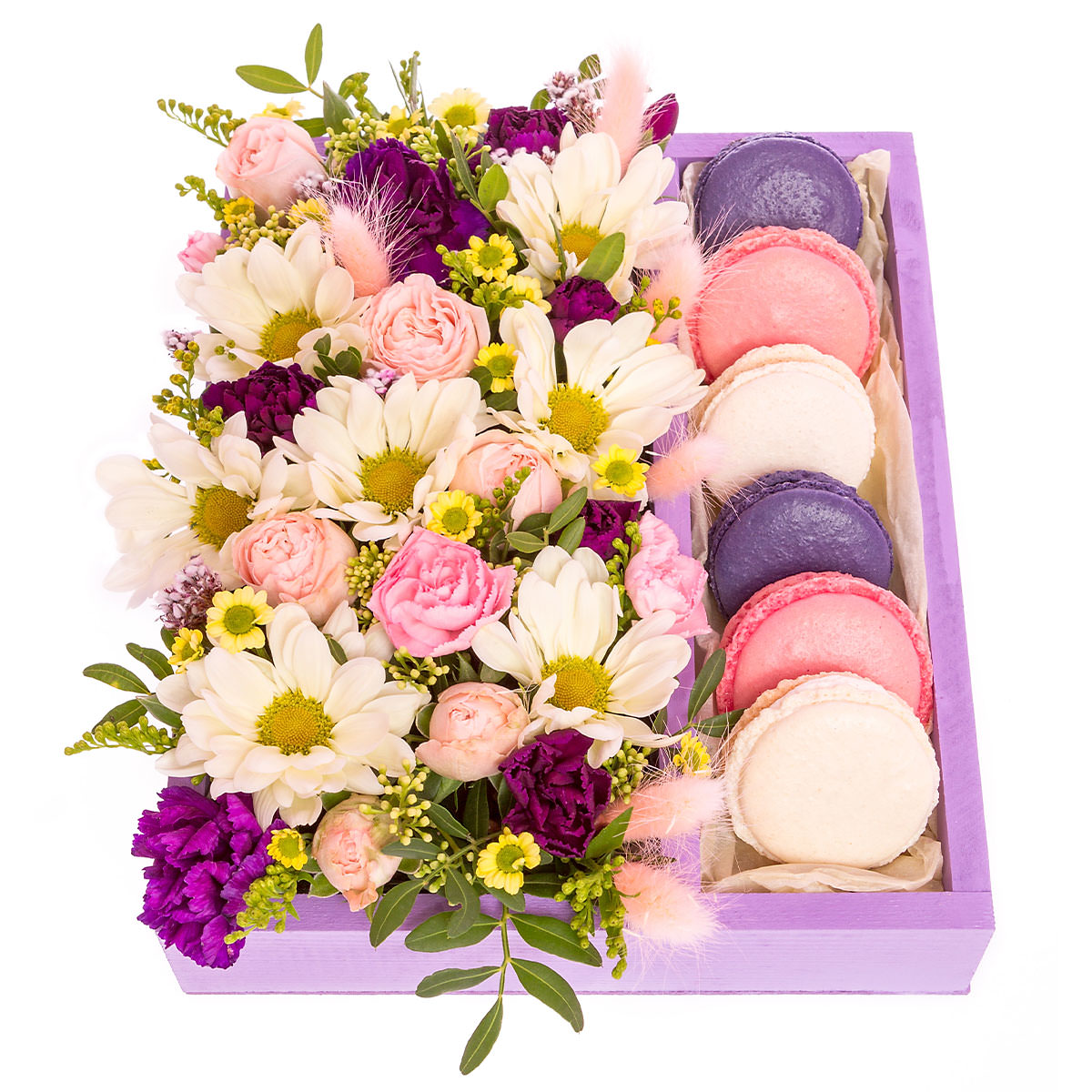 Ромашка белая, гвоздика фиолетовая, хризантема кустовая желтая, лагурус, солидаго, макарон. Упаковка (Корзина, оазис, ящик).