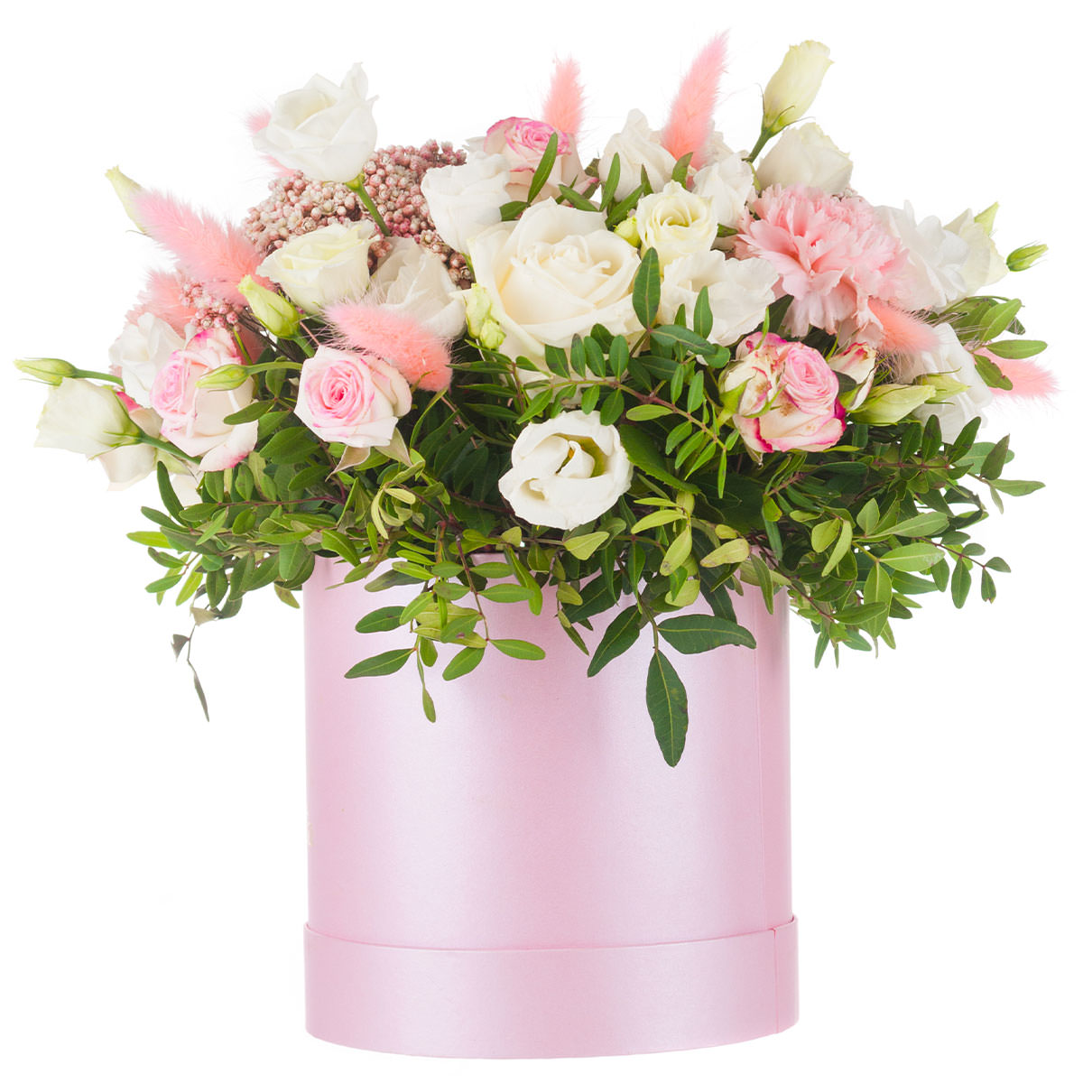 Роза одноголовая белая, роза кустовая розовая, эустома белая, гвоздика розовая, лагурус, озотамнус, фисташка. Упаковка (шляпная коробка, квадратный бокс, коробка сердце, оазис)